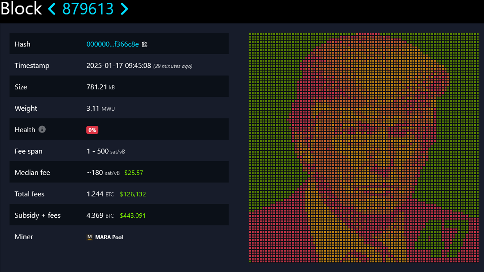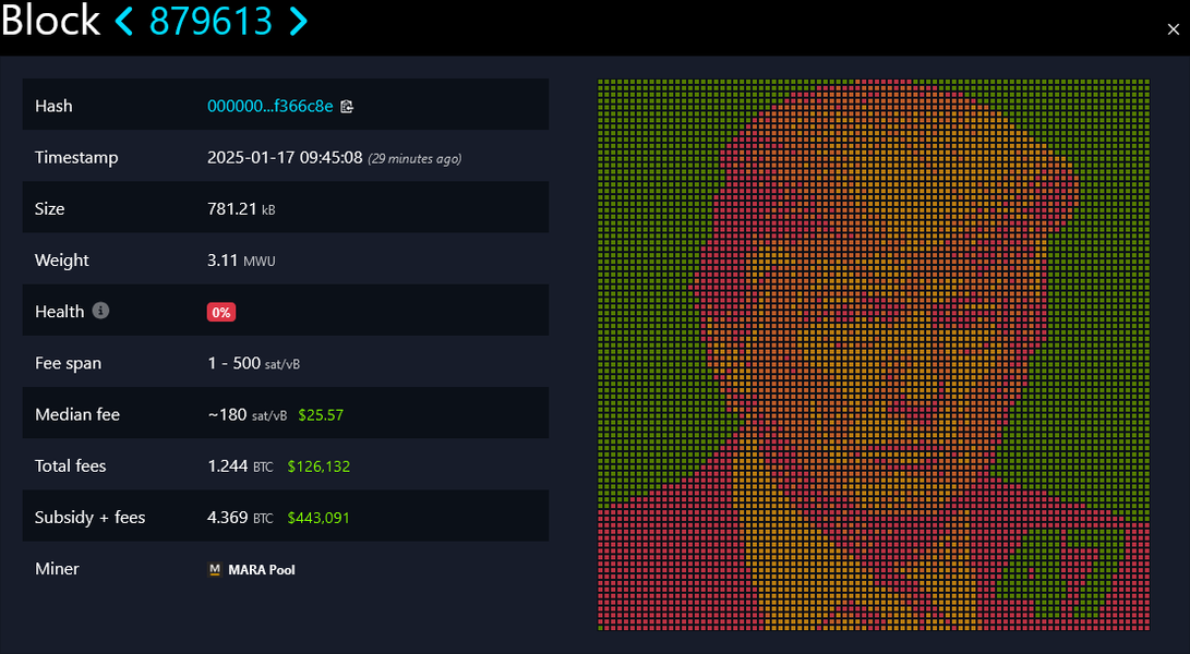 Marathon Digital Holdings (MARA) — крупнейший майнер Bitcoin на Уолл-стрит — встроил портрет избранного президента в блок 879613, тем самым сделав Трампа частью публичного реестра Bitcoin. И благодаря особенности самого блокчейна, этот блок будет находиться там до тех пор, пока будет существовать сам Bitcoin.