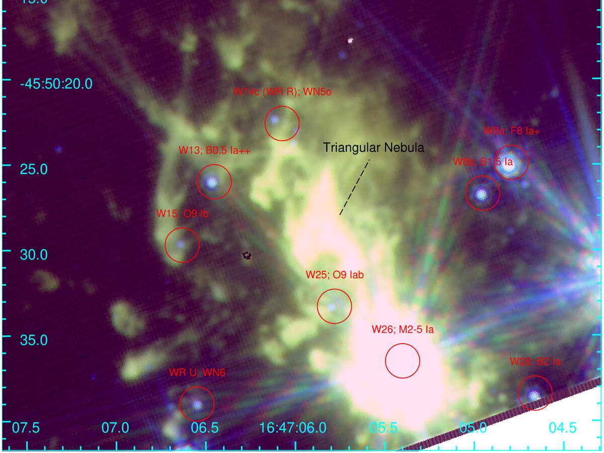 Скопление содержит множество редких сверхгигантских звёзд, масса которых в 8–100 раз превышает массу Солнца. В отличие от звёзд наподобие нашего светила, живущих миллиарды лет, эти космические гиганты «сгорают» за несколько миллионов лет, теряя большую часть массы через звёздный ветер и взрывные выбросы.