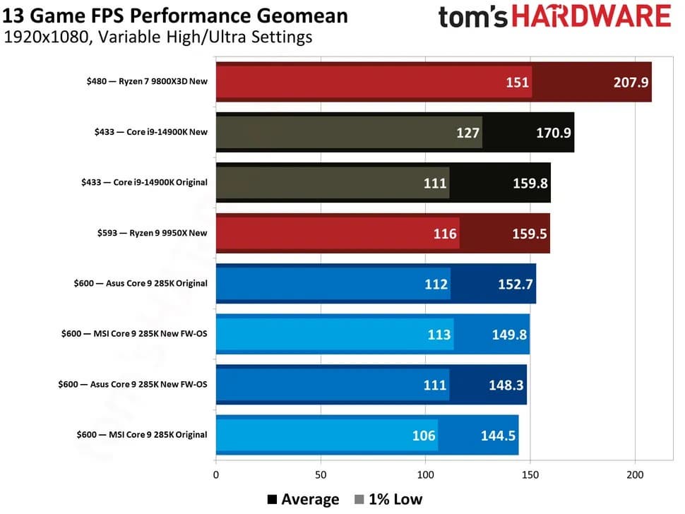 Core i9-14900K всё ещё быстрее, причём на этот процессор обновления Windows повлияли даже сильнее. В итоге, если в первых тестах источника этот CPU обходил Core Ultra 9 285K на 6,4%, то теперь разница выросла до 14%! Ну и до Ryzen 7 9800X3D новинкам Intel, как и ранее, очень далеко.