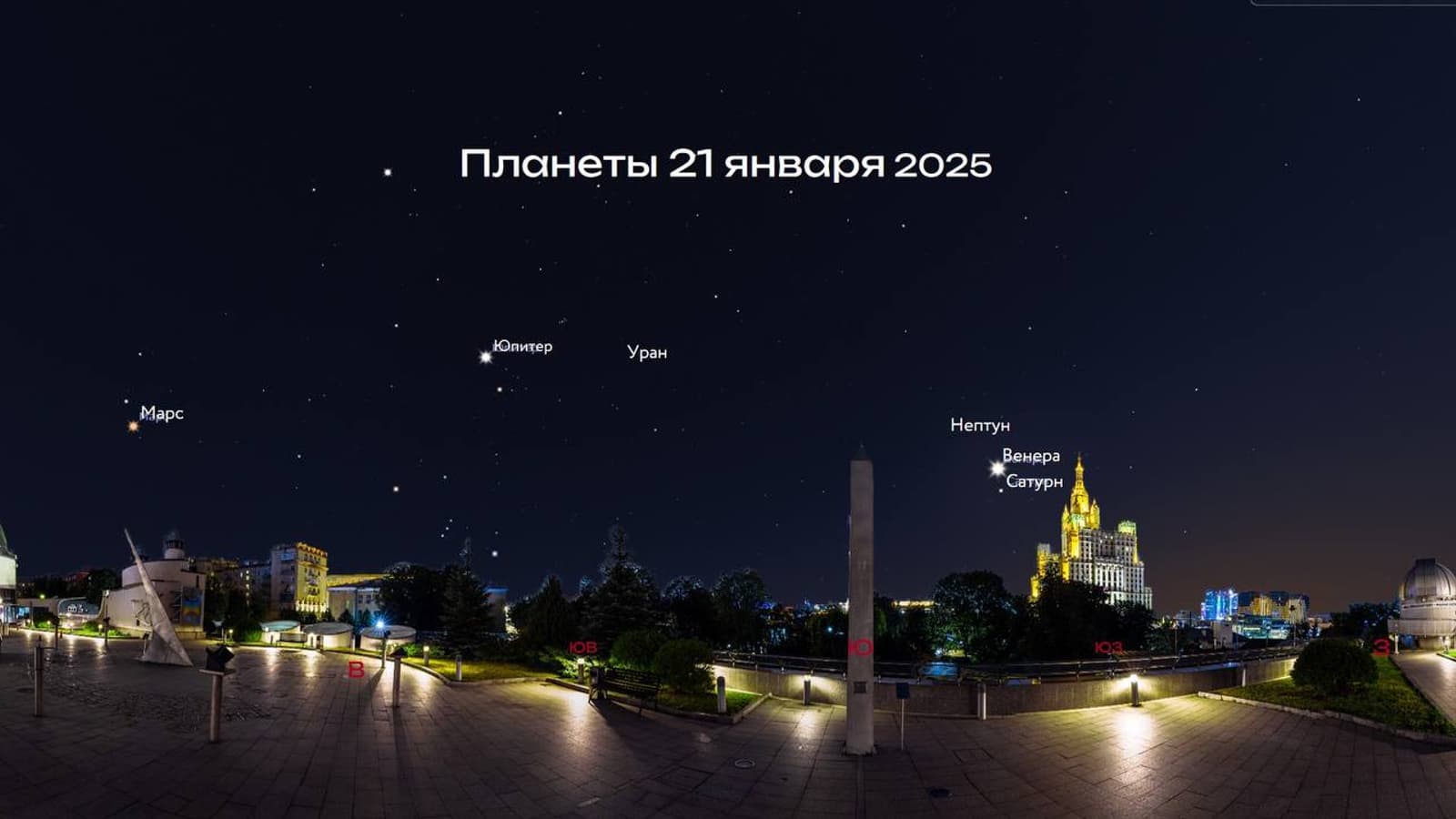 Начинать наблюдения нужно после 17:30 по московскому времени. При ясной погоде на закатном небе можно легко найти яркую Венеру, немного ниже расположен Сатурн, Нептун находится чуть выше и левее Венеры, но его можно найти только в телескоп. После 21:00 эта троица скроется за горизонтом, но всю ночь высоко в небе будут сиять Юпитер и Марс. Уран тоже можно найти в телескоп, он располагается правее яркого Юпитера.