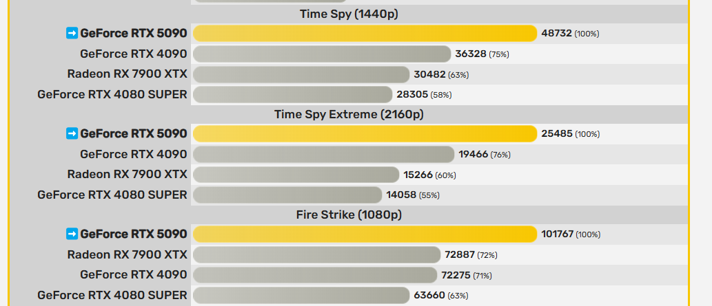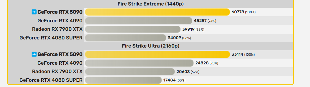 Результатов много для разных тестов этого бенчмарка. И в среднем GeForce RTX 5090 опережает RTX 4090 примерно на 30-35%. Это неплохо, учитывая, насколько вторая мощная сама по себе.