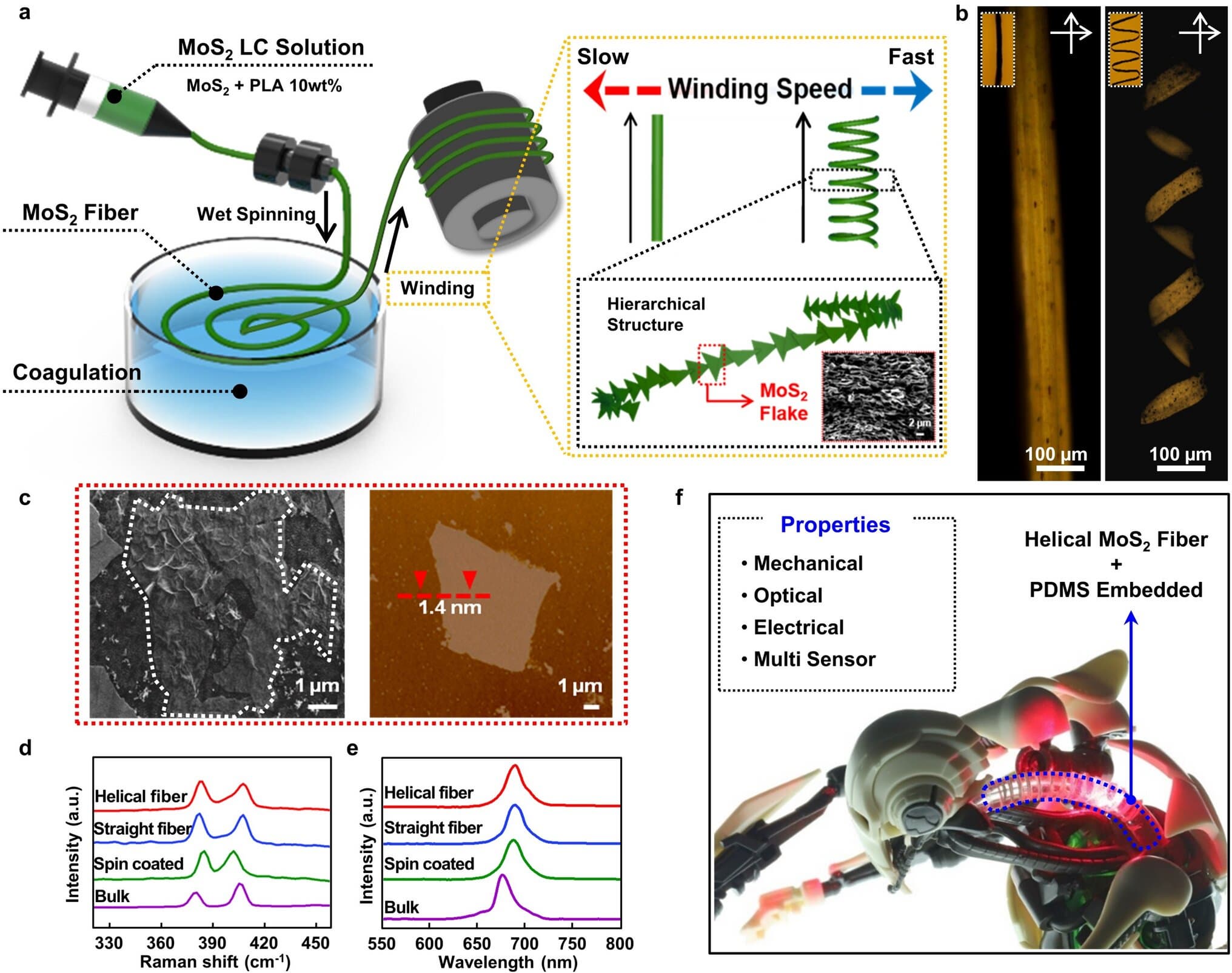 Команда представила эти технологии как новую сенсорную платформу, способную одновременно определять и обрабатывать множество сигналов, подобно пяти человеческим чувствам. В ходе исследования были созданы волокна, которые могут свободно принимать трёхмерную форму благодаря специальному производственному процессу на основе дисульфида молибдена (MoS2). Примечательно, что трёхмерная спиральная структура волокон, естественным образом формирующаяся при их выравнивании в ленточную форму, позволяет точно контролировать их изгиб.
