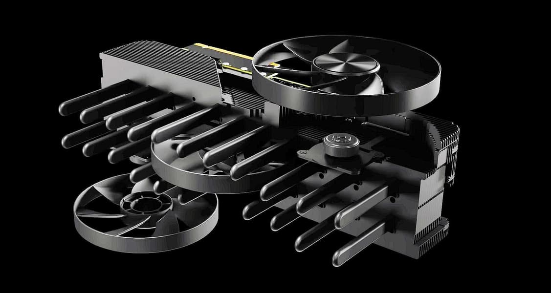 Nvidia поделилась 3D-моделью, которая раскрывает все особенности. Тут и маленькая печатная плата, которая расположена перпендикулярно привычному размещению, и очень сложный радиатор, и три вентилятора, которые тоже размещены нетипично.