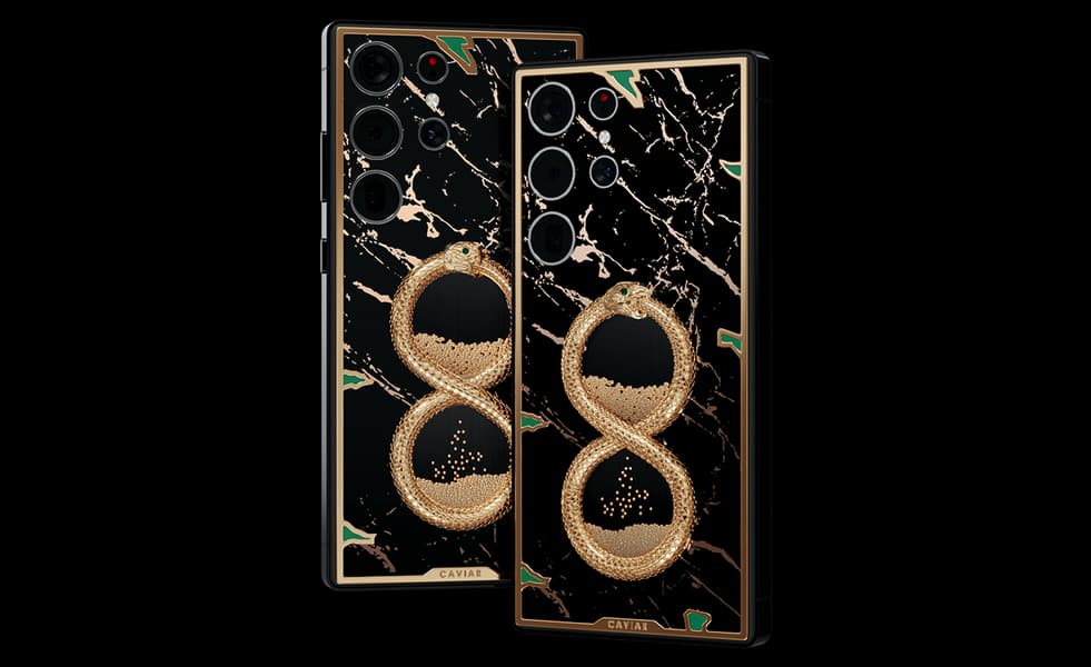 Флагман коллекции, Samsung S25 Ultra Ouroboros, по цене от 899 тысяч украшен объемным изображением золотого уробороса, покрытым золотом 999 пробы. В Caviar рассказали: