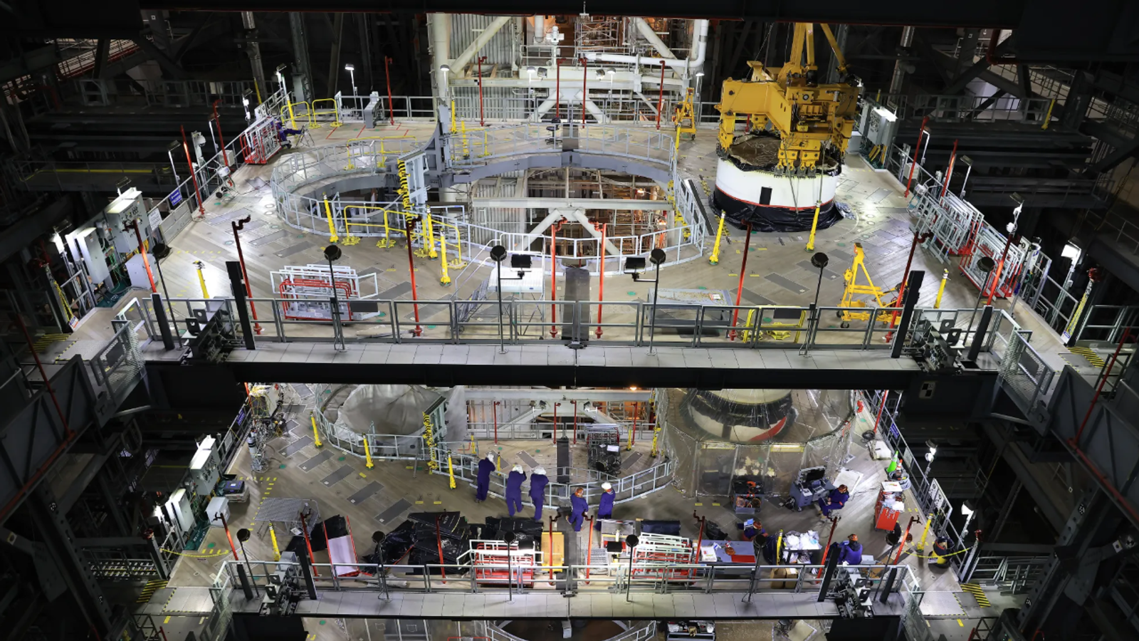 В космическом центре НАСА имени Кеннеди во Флориде продолжается подготовка к миссии Artemis II. Команды программы наземных систем исследований агентства ведут активную работу по сборке твердотопливных ускорителей ракеты-носителя SLS (Space Launch System) внутри здания вертикальной сборки (VAB).