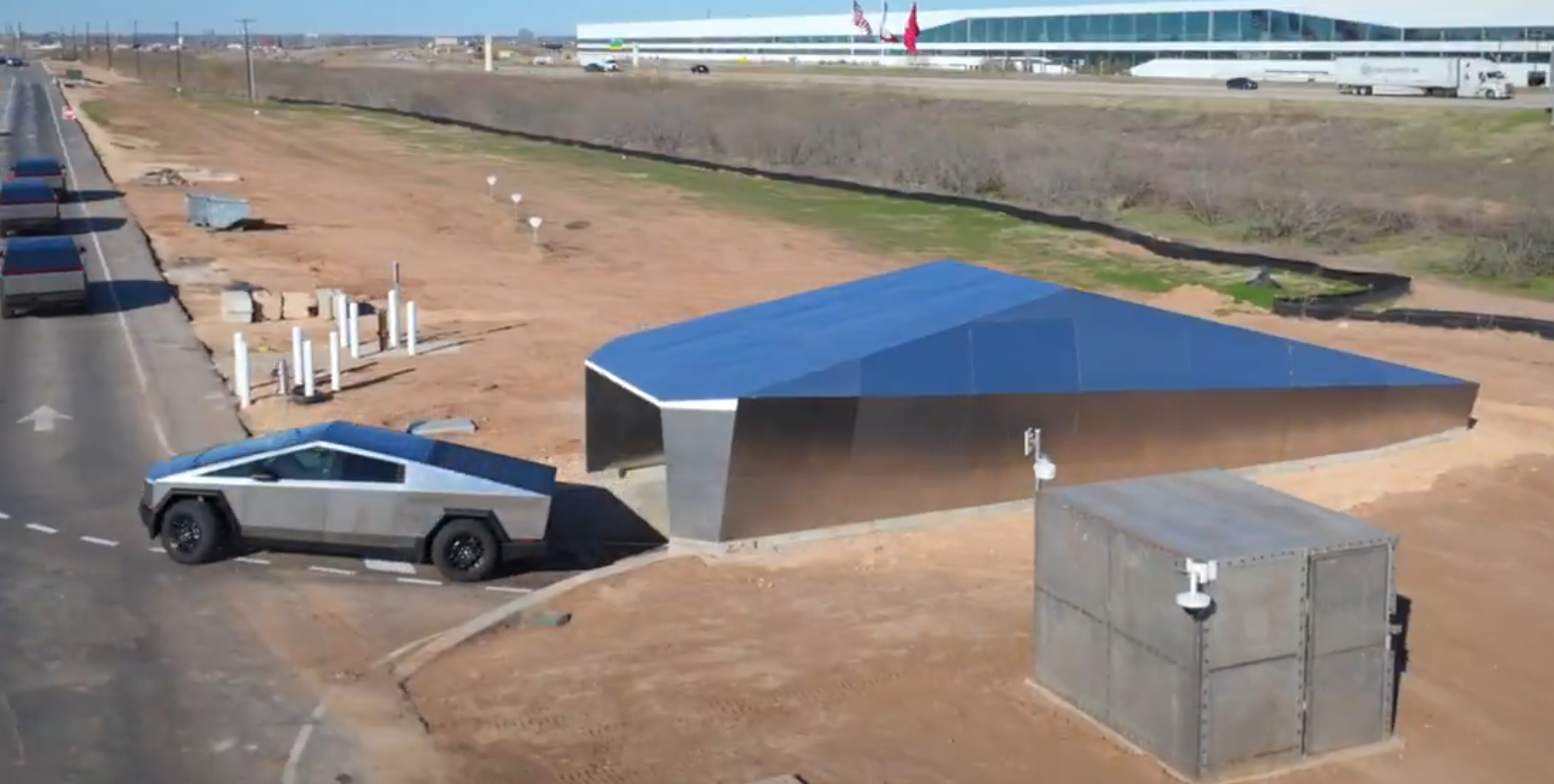 Tesla добавила металлические панели вокруг внешней стороны выхода, чтобы соответствовать уникальному внешнему виду Cybertruck из нержавеющей стали.