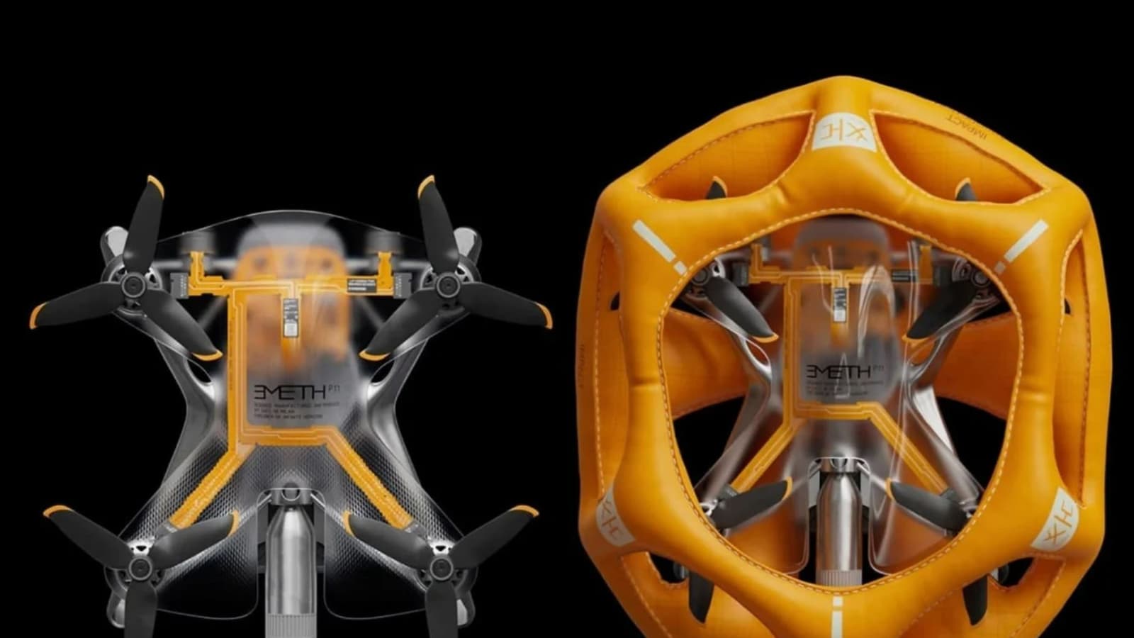 Emeth изготовлен методом селективного лазерного плавления (L-PBF) из алюминиево-магниевого сплава, который прочнее и легче углеродного волокна. Главная особенность дрона — запатентованная система быстрого развертывания воздушной подушки (всего за 40 миллисекунд) в случае аварийной посадки. Подушка многоразовая и достаточно прочная. Система стабилизации камеры также использует нитинол – высокотехнологичный сплав с памятью формы, который обеспечивает устойчивость камеры и одновременно управляет аварийной системой спасения. Это позволило уменьшить массу и размеры дрона. Еще одна особенность Emeth — прозрачный корпус, демонстрирующий внутреннее устройство.
