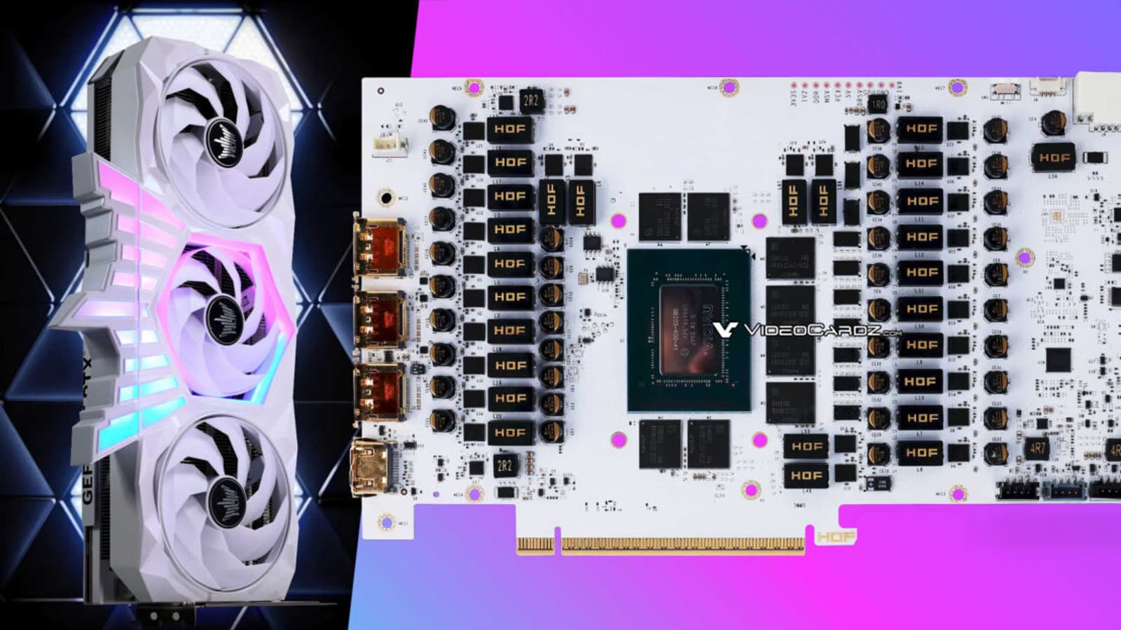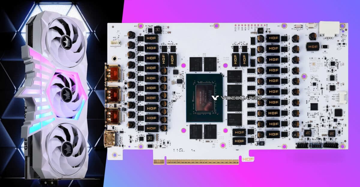 Модель HOF OC Lab Edition выделяется усиленной подсистемой питания с 26 фазами, качественной компонентной базой и белым цветом как печатной платы, так и системы охлаждения. Для сравнения, у модели Asus Astral, которая является одной из самых дорогих на рынке, 20-фазная подсистема питания, а у эталонной FE — 15-фазная.