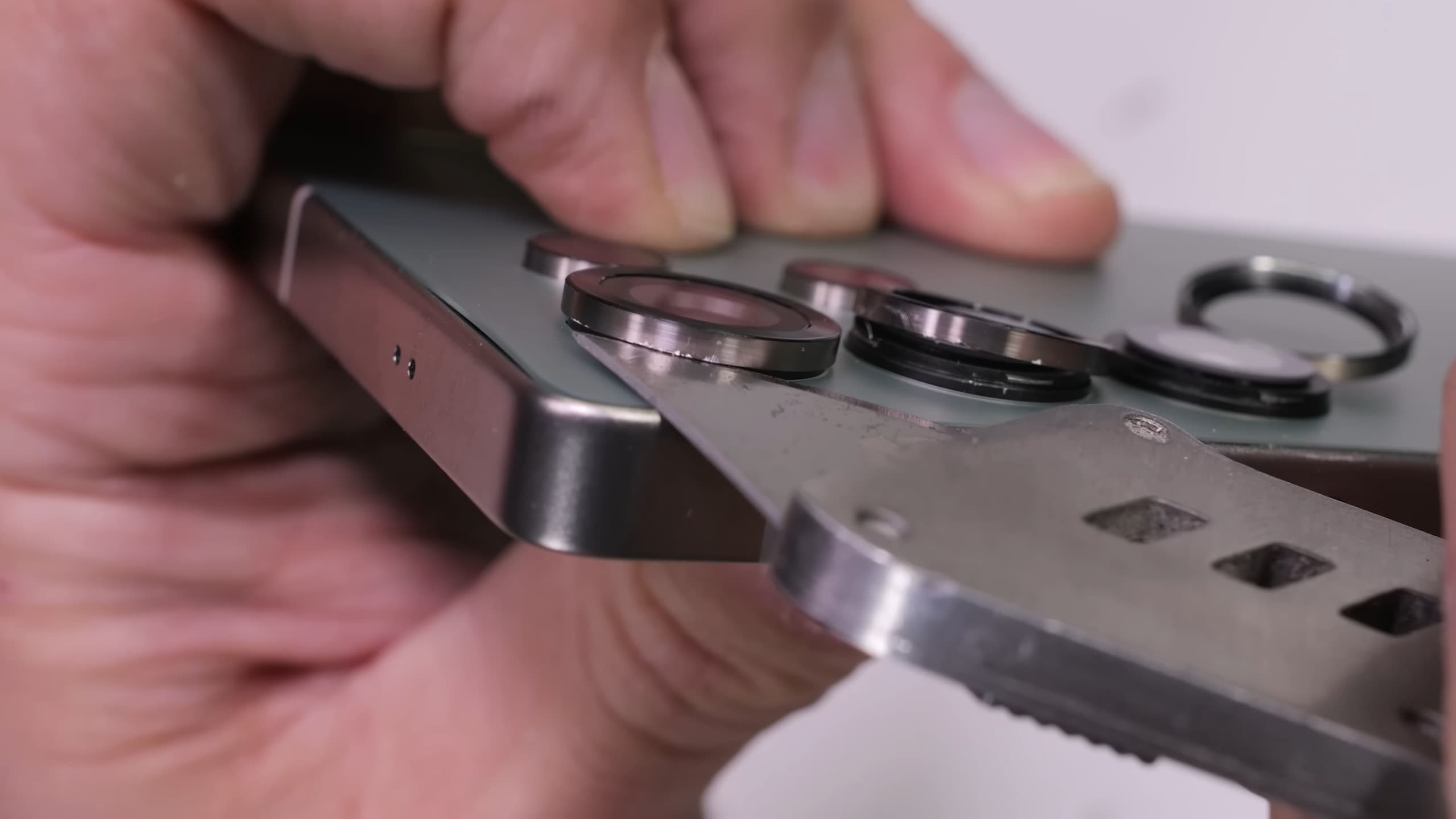 Как обычно, экран можно поцарапать материалом с твёрдостью 6 по шкале Мооса, и тут как минимум для обычных смартфонов ничего нового нет. Но зато блогер решил попробовать сковырнуть кольца вокруг модулей камеры, и у него получилось. Но на самом деле приклеены они очень хорошо, так что при обычной эксплуатации никаких проблем с этими элементами быть не должно.
