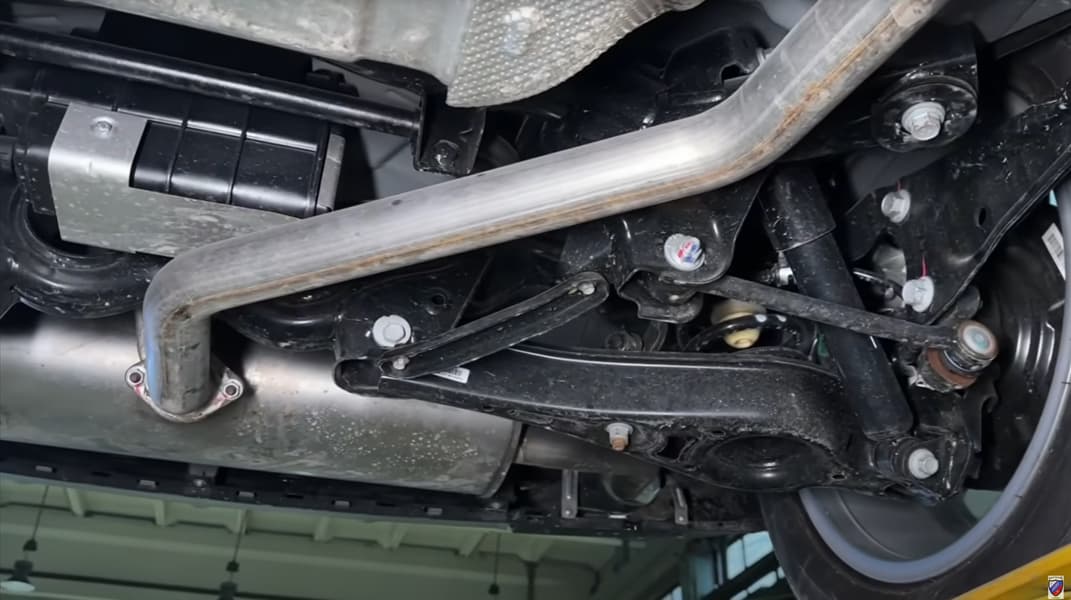 Осматривая подвеску, Илья Свиридов удивился наличию сзади подрамника и четырех рычагов с каждой стороны: обычно в таких недорогих «китайцах» сзади устанавливается балка. При этом ведущий придрался к одному рычагу: он плоский и не имеет ребер жесткости.