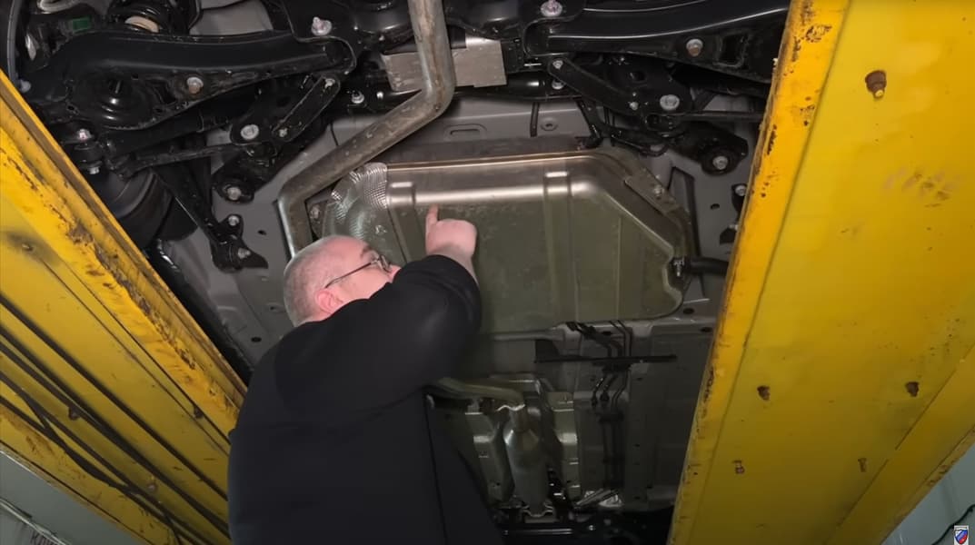 На днище обнаружились торчащие пластиковые экраны, которые легко оторвать на бездорожье. Топливный бак изготовлен из нержавеющей стали, а конфигурация лонжеронов довольно странная — выгнутая.