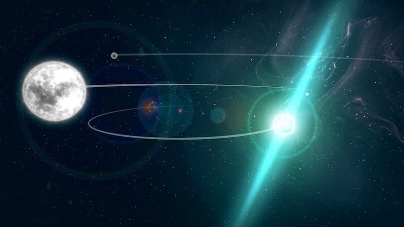 Пульсар PSR J0337+1715 был открыт ещё в 2014 году и примечателен тем, что входит в уникальную тройную звёздную систему, состоящую из самого пульсара и двух белых карликов. Все три звезды расположены в пределах орбиты, сопоставимой по размеру с орбитой Земли вокруг Солнца.
