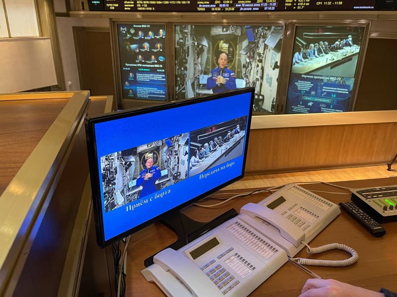 На опубликованных снимках видны кадры из Центра управления полетами в Королеве, на которых видно, как космонавт с борта станции по видеосвязи представляет комиссии свою научную работу.