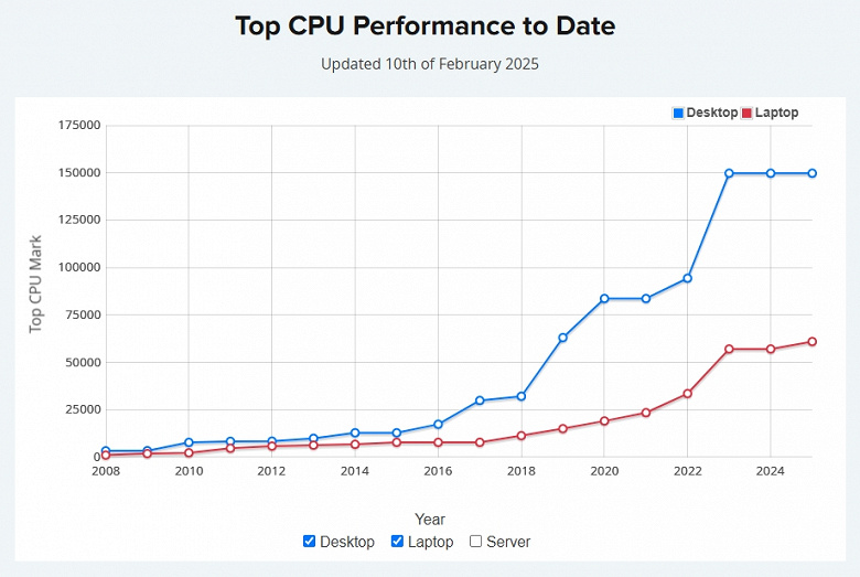 Что интересно, если посмотреть на график, который формируется посредством результатов самых мощных CPU, то тут спада нет, но есть плато, причём ещё с 2023 года.