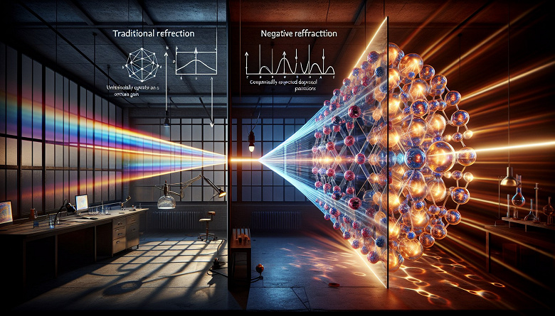 Отрицательное преломление – это необычное явление, при котором свет изгибается в противоположном направлении по сравнению с обычным поведением. Долгое время учёные пытались добиться этого эффекта с помощью искусственно созданных метаматериалов, но сталкивались с проблемами несовершенства изготовления и потерь энергии.