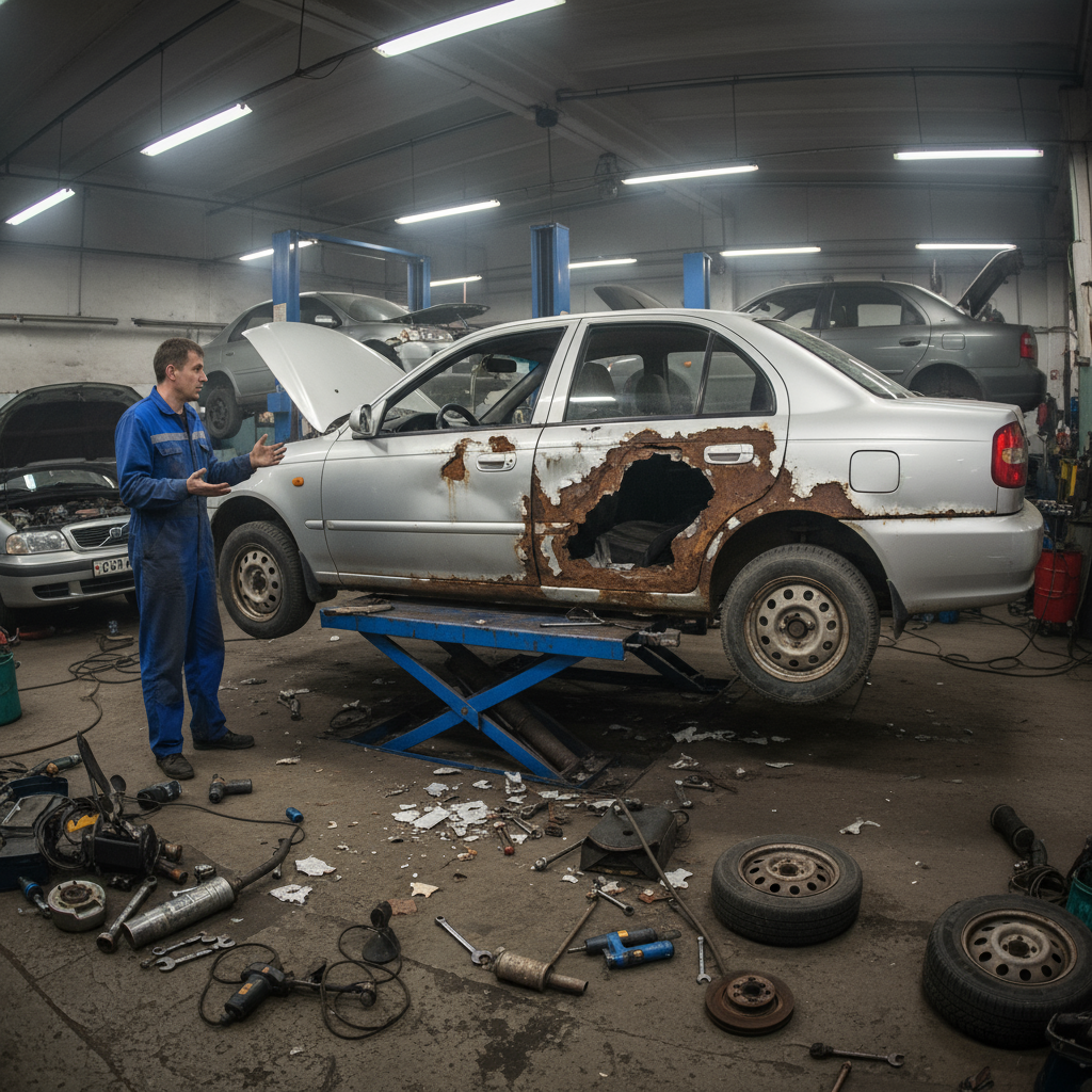 После года простоя, Сергей решил отремонтировать машину, но приехав на СТО, услышал окончательный вердикт мастеров: «Восстановление нецелесообразно». Было решено разобрать машину на запчасти. Двигатель, КПП, стартер, генератор — всё это ещё могло служить. И вот, разбирая машину, стало очевидно, насколько всё плохо — кузов был в ужасном состоянии, просто рассыпался на части.