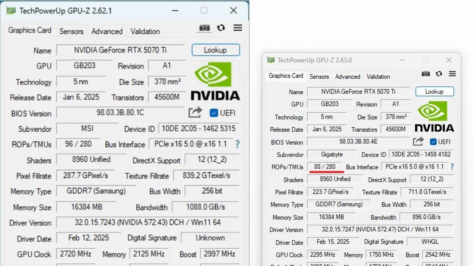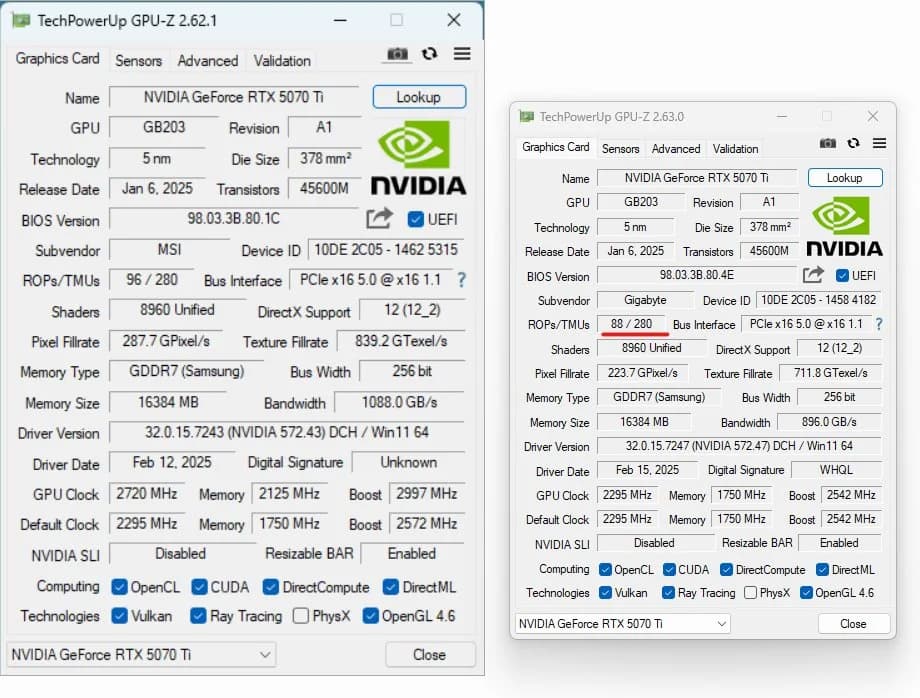 Вчера Nvidia подтвердила проблему с «нехваткой» блоков растеризации во флагманских видеокартах GeForce RTX 5090 и RTX 5090D, а также удивила тем, что такая же проблема характерна и для GeForce RTX 5070 Ti. А теперь сообщается о первом выявленном случае проблемы с младшим ускорителем: Вэн Сен Чан (Weng Seng Chan) обнаружил, что в его новенькой GeForce RTX 5070 Ti меньше ROP, чем заявлено — 88 вместо 96.