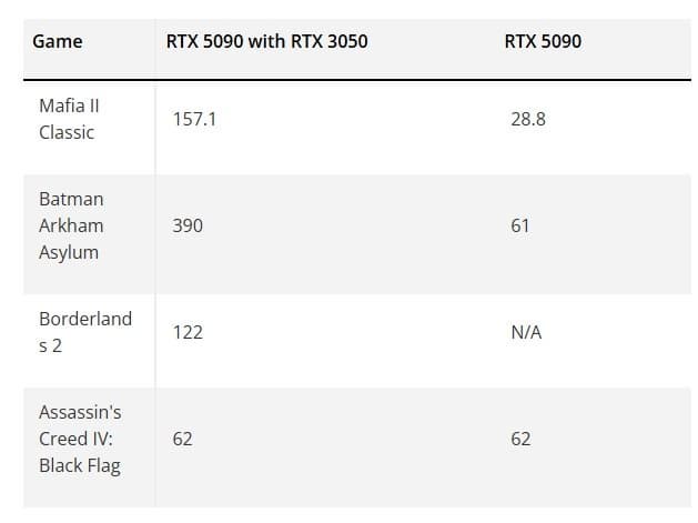 И это помогло. Разница в производительности между двумя режимами — в пять раз и более. Как минимум одну игру RTX 5090 без помощи RTX 3050 вообще запустить не смогла.