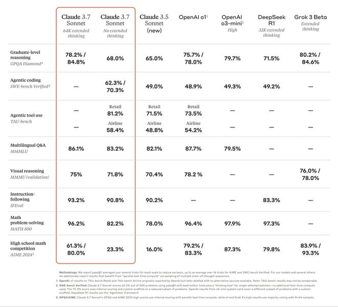 Разработчики называют Claude 3.7 Sonnet первой на рынке гибридной размышляющей моделью. Формально у неё режим размышления включается отдельным параметром без смены модели, а у OpenAI и xAI для этого нужно выбрать другую модель.