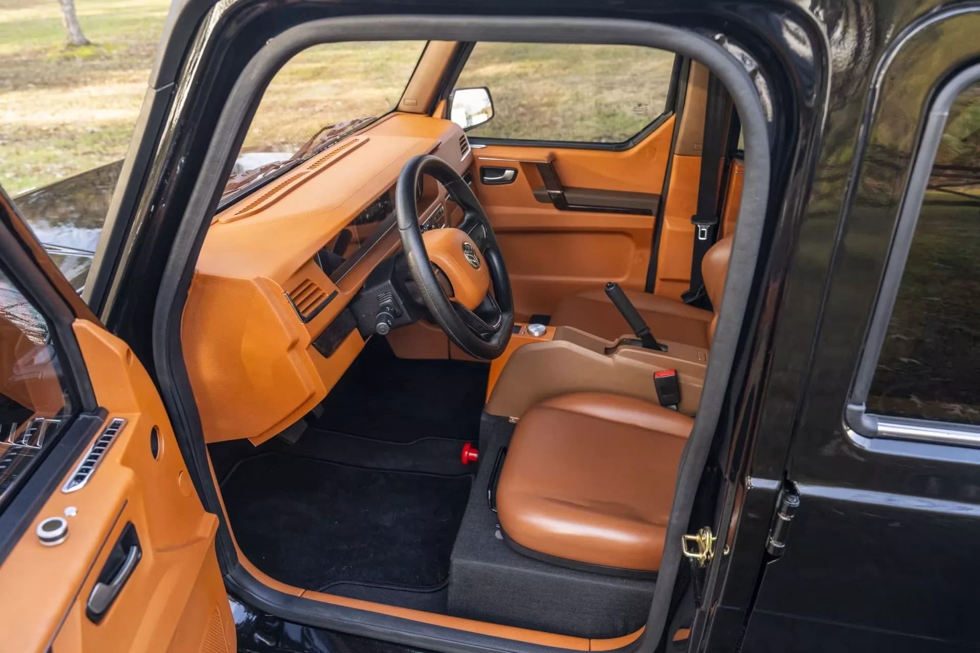 Машина оснащена рабочими фарами, поворотниками и стеклоочистителями. Она получила держатель запасного колеса, а также стильные двухцветные колеса.
