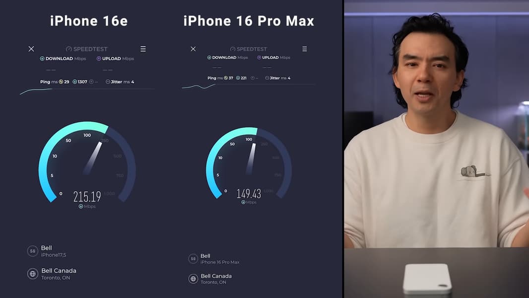 У крупного блогера Dave2D в тестах всё было полностью наоборот. iPhone 16e показал скорость до 215 Мбит/с, тогда как iPhone 16 Pro Max с модемом Snapdragon X71 — до 153 Мбит/с. Тут стоит сказать, что аппараты не задействовали mmWave, иначе старшая модель была бы заметно быстрее.