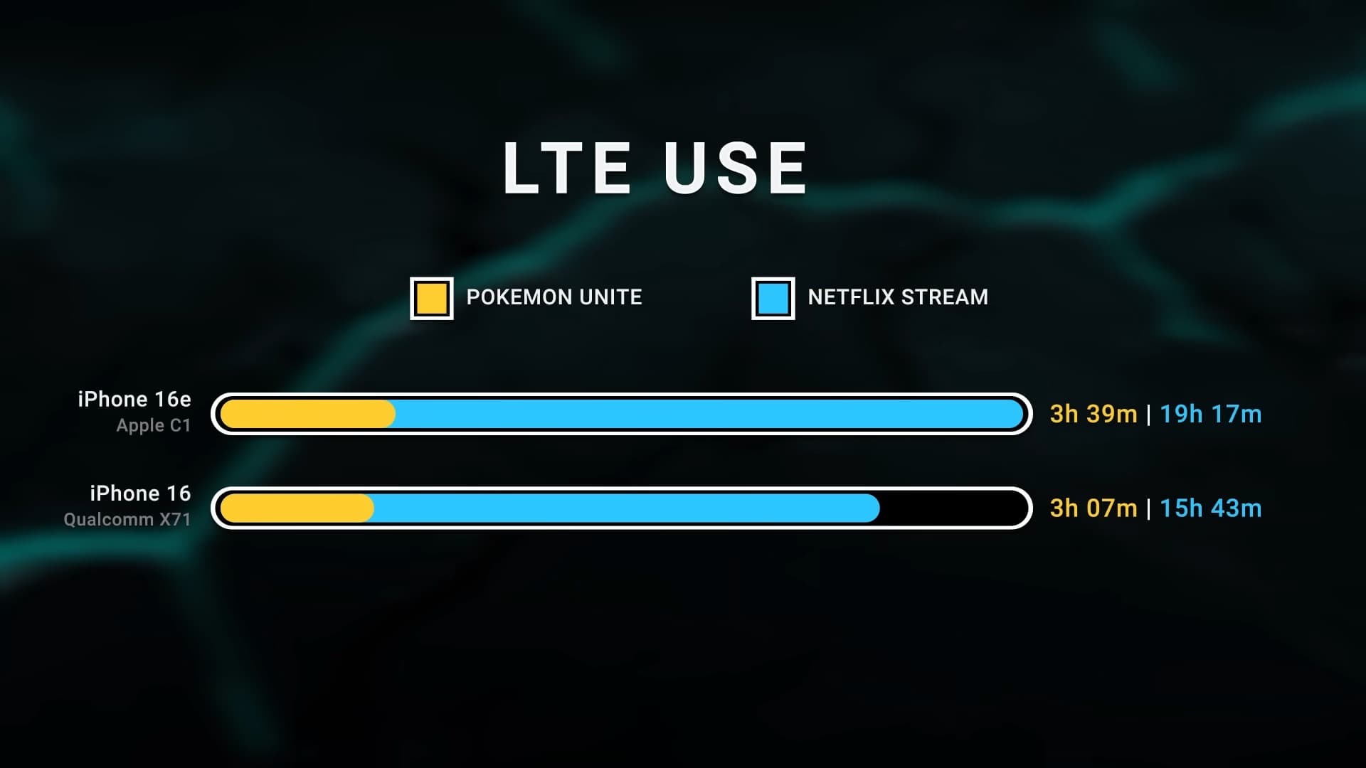 Более того, Apple C1 5G ещё и энергоэффективнее. При сравнении с iPhone 16 разница при просмотре Netflix была весьма заметной: 19 часов 17 минут у новинки против 15 часов 43 минут у iPhone 16. А вот в игре Pockemon Unite разница была не так заметна: 3 часа 39 минут против 3 часов 7 минут.