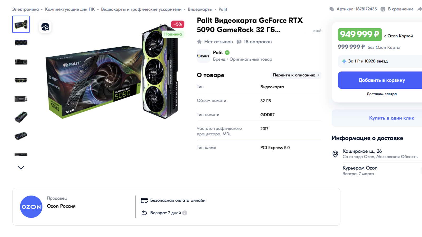 Цена на новую видеокарту Palit GeForce RTX 5090 GameRock с 32 ГБ памяти достигла рекордных 949 999 рублей с учетом скидки по карте Ozon. Без скидки цена составляет 1 млн рублей. Интересно, что по той же ссылке некоторые клиенты видят другую цену — 400 000 рублей.