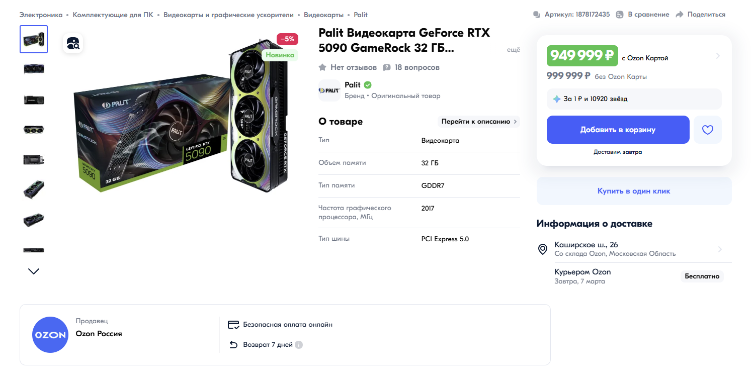 Цена на новую видеокарту Palit GeForce RTX 5090 GameRock с 32 ГБ памяти достигла рекордных 949 999 рублей с учетом скидки по карте Ozon. Без скидки цена составляет 1 млн рублей. Интересно, что по той же ссылке некоторые клиенты видят другую цену — 400 000 рублей.