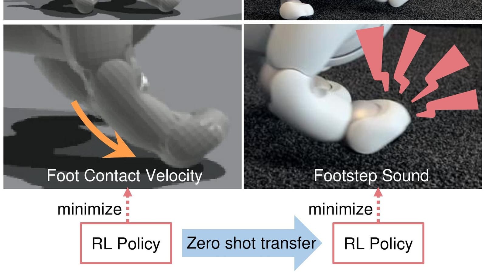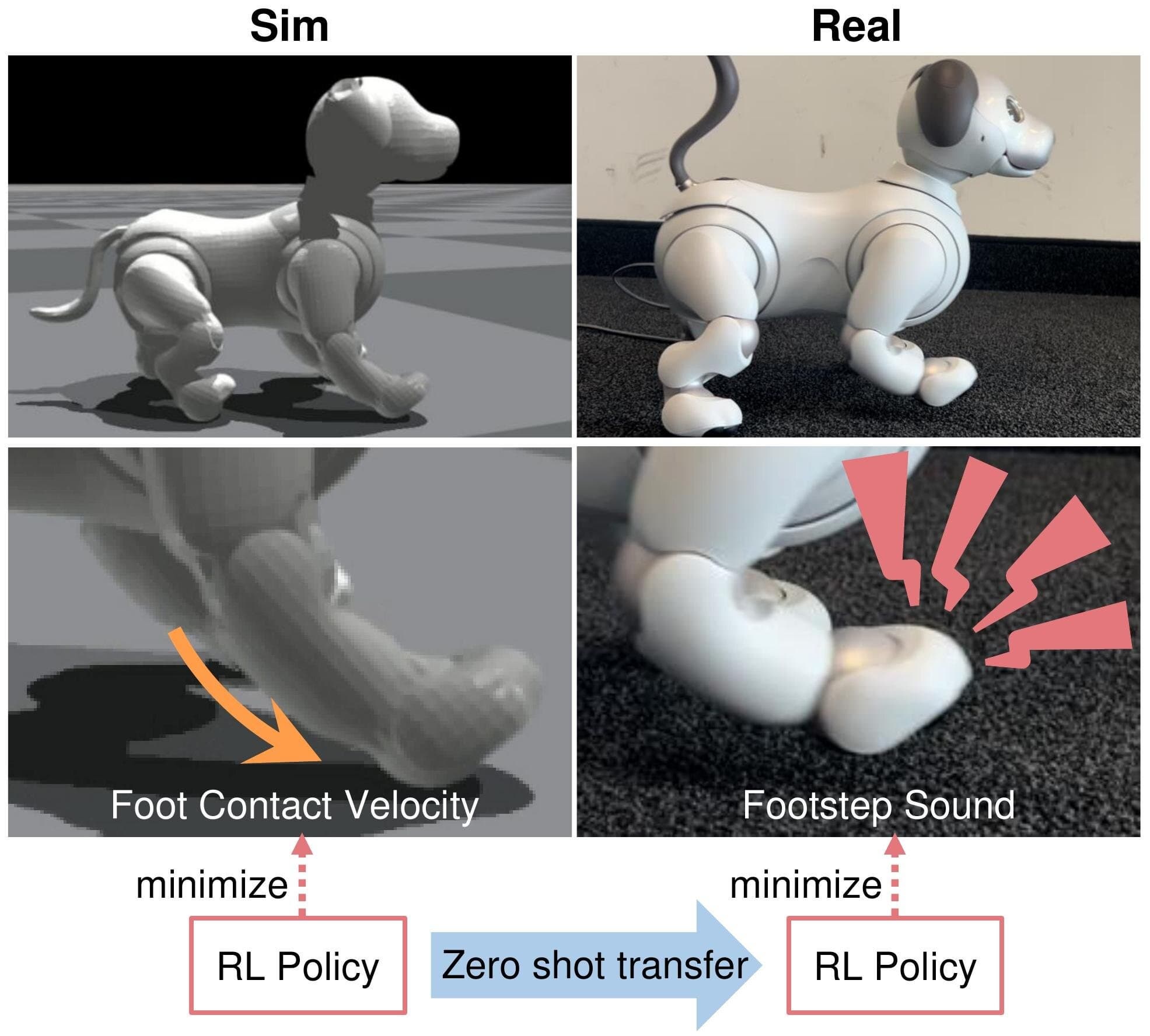 Пользователи Aibo неоднократно жаловались на шум, который робот издаёт при ходьбе. Для решения этой проблемы команда под руководством Рё Ватанабэ разработала RL-алгоритм, снижающий громкость шагов за счёт минимизации скорости контакта лап с поверхностью в физическом симуляторе.