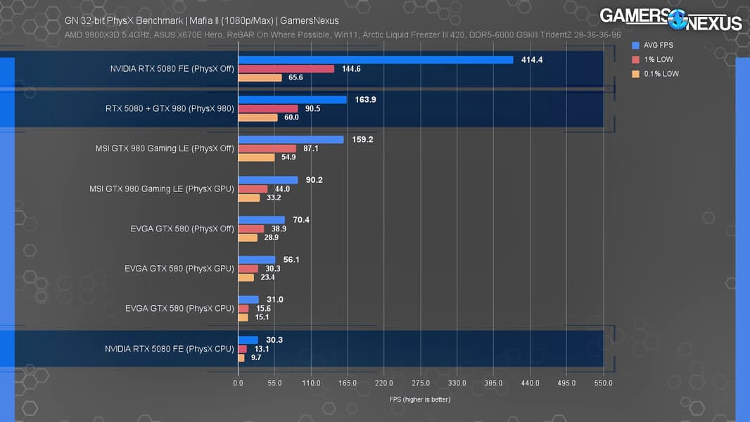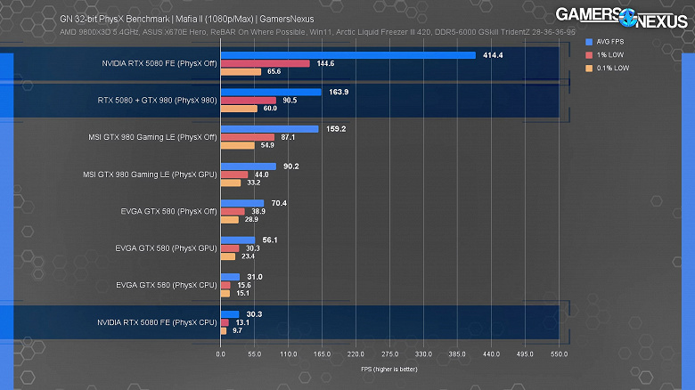 Как известно, Nvidia отключила поддержку 32-битной версии PhysX для видеокарт GeForce RTX 50, из-за чего они в соответствующем режиме сильно проигрывают более старым картам. Авторы Gamers Nexus решили сравнить RTX 5080 в том числе с GTX 580, вышедшей в далёком 2010 году.