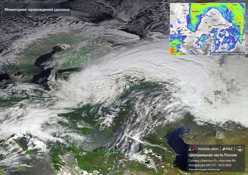 На изображениях, полученных с аппаратов «Арктика-М» и «Электро-Л», показано, как циклон накрыл столицу России. Эти спутники являются частью системы «Электро», которая предназначена для мониторинга погоды и климата с геостационарной орбиты.