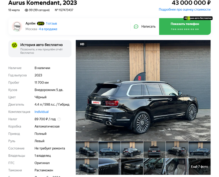 В России выставлен на продажу первый Aurus Komendant с пробегом — люксовый российский внедорожник 2023 года выпуска.