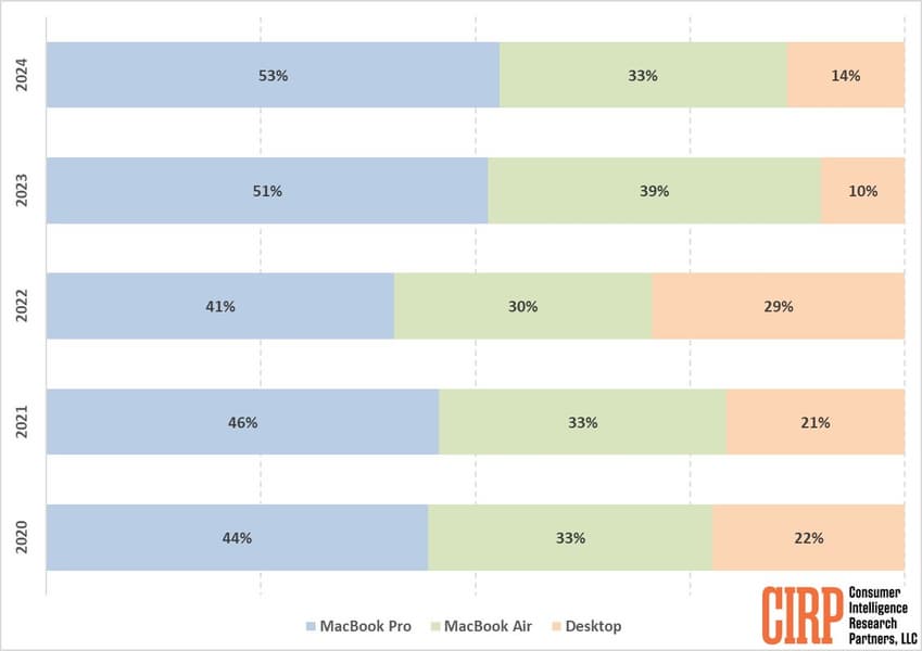 Как можно видеть, в прошлом году 53% покупателей таких ПК выбрали MacBook Pro. И это почти столько же, сколько и годом ранее, но это всё же самое большое значение для этих ПК за последние годы.