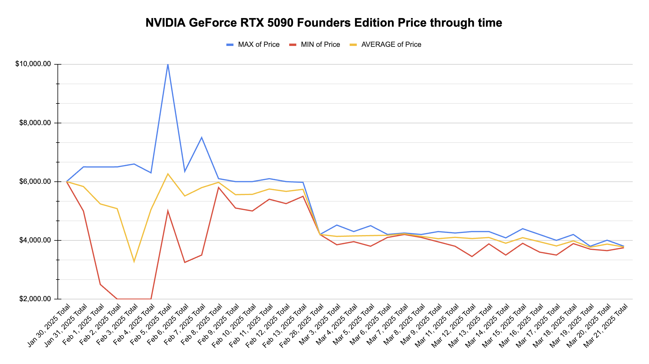 Ситуация с видеокартами GeForce RTX 50 остаётся очень тяжёлой и вряд ли это изменится в ближайшее время. Однако статистика eBay показывает, что как минимум цены на RTX 5090 FE стабильно падают.