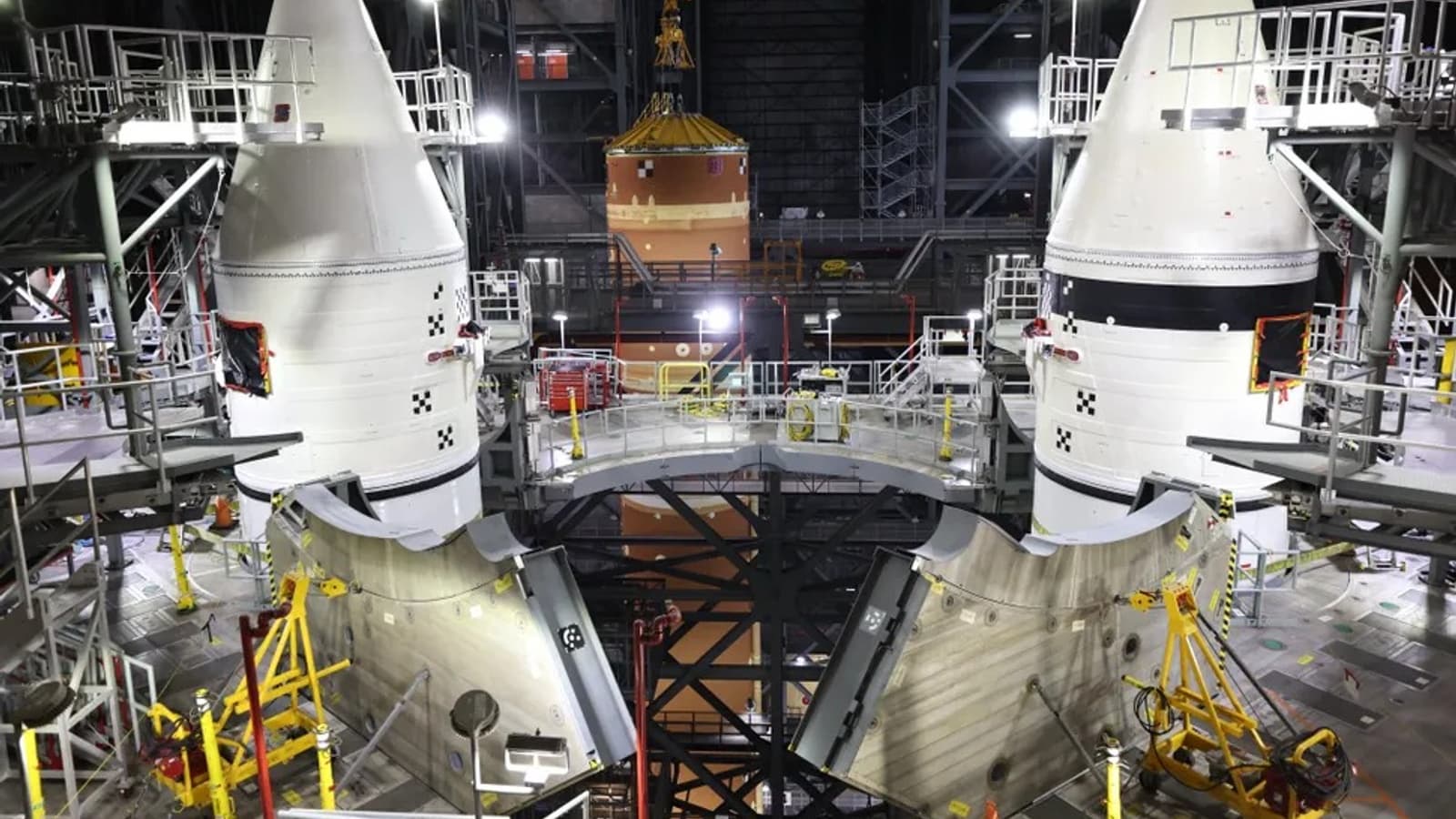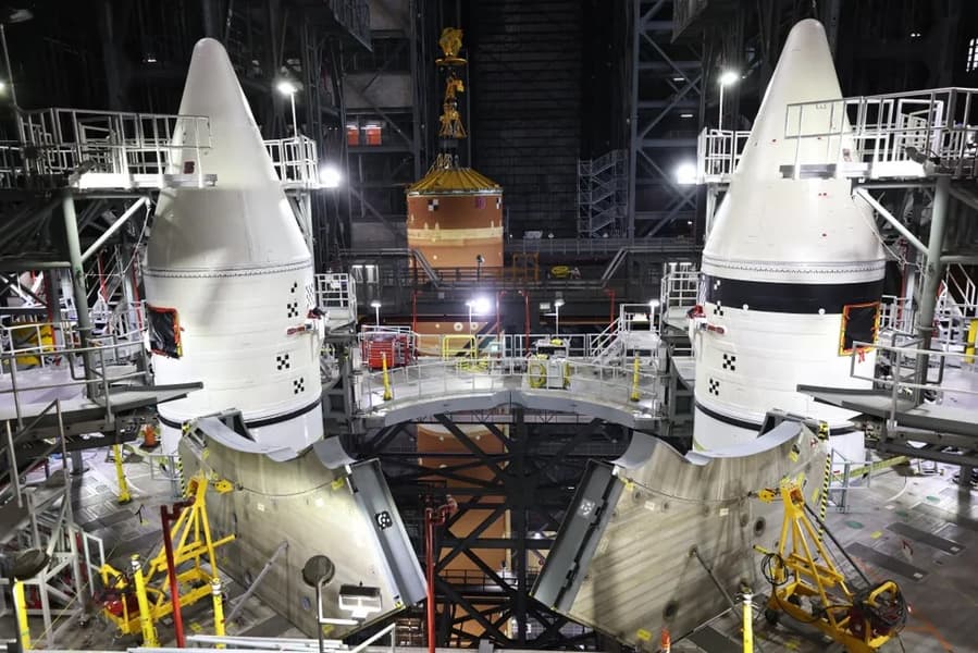 Работы велись в High Bay 3 — секции VAB, где ранее собирали ракеты Saturn V для программы «Аполлон». Одновременно инженеры готовят к интеграции космический корабль Orion: на его служебном модуле установлены солнечные панели и адаптер для сброса обтекателей. В ближайшие месяцы Orion будет закреплён на вершине SLS над временной криогенной двигательной установкой.