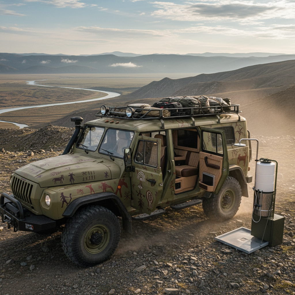 Для путешествий предусмотрены экспедиционный багажник, шноркель, дополнительное освещение на крыше, лебёдка и бак с водой для походного душа.