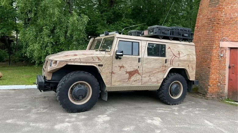 Судя по году выпуска, это один из первых «Тигров» гражданской серии, доработанный в 2011 году ателье TuningUp. Кузов украшен графикой в стиле наскальных рисунков, на нём установлен шильдик, подтверждающий авторство тюнеров.