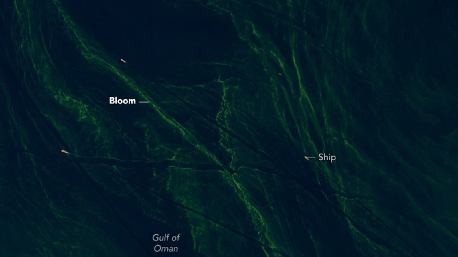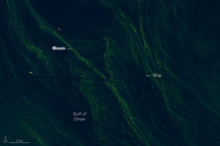 С февраля по март 2025 года несколько орбитальных аппаратов, включая Landsat 8 и PACE (Plankton, Aerosol, Cloud, Ocean Ecosystem), наблюдали динамичное развитие фитопланктонных масс, которые дрейфовали из залива в Аравийское море. 8 марта инструмент OLI (Operational Land Imager) на борту Landsat 8 запечатлел узкие извилистые полосы микроорганизмов, сформированные течениями и водоворотами. Схожие изображения получил и спектрометр OCI спутника PACE, дополнив их данными о концентрации хлорофилла в поверхностных водах.
