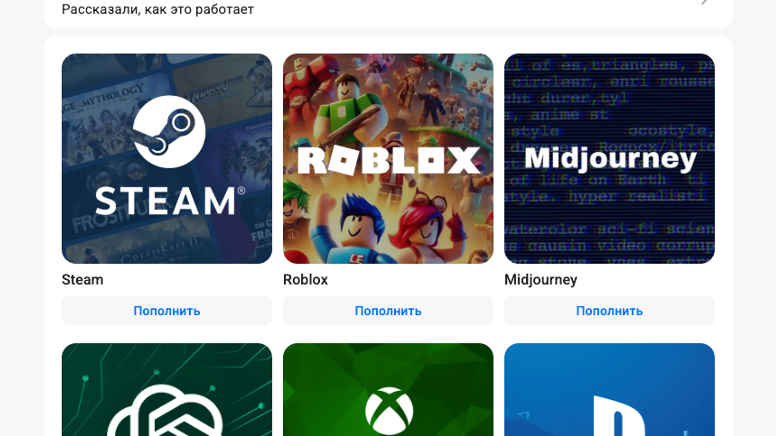 Оплата ИИ-сервисов появилась в разделе «Киоск», через который ранее пользователи могли пополнять баланс Steam, Roblox, Fortnite, PUBG, PlayStation, Xbox, Twitch, и так далее. Помимо уже упомянутых ChatGPT и Midjourney, в «Киоске» доступна оплата Udio, Suno AI, Mistral AI, Krea.AI.