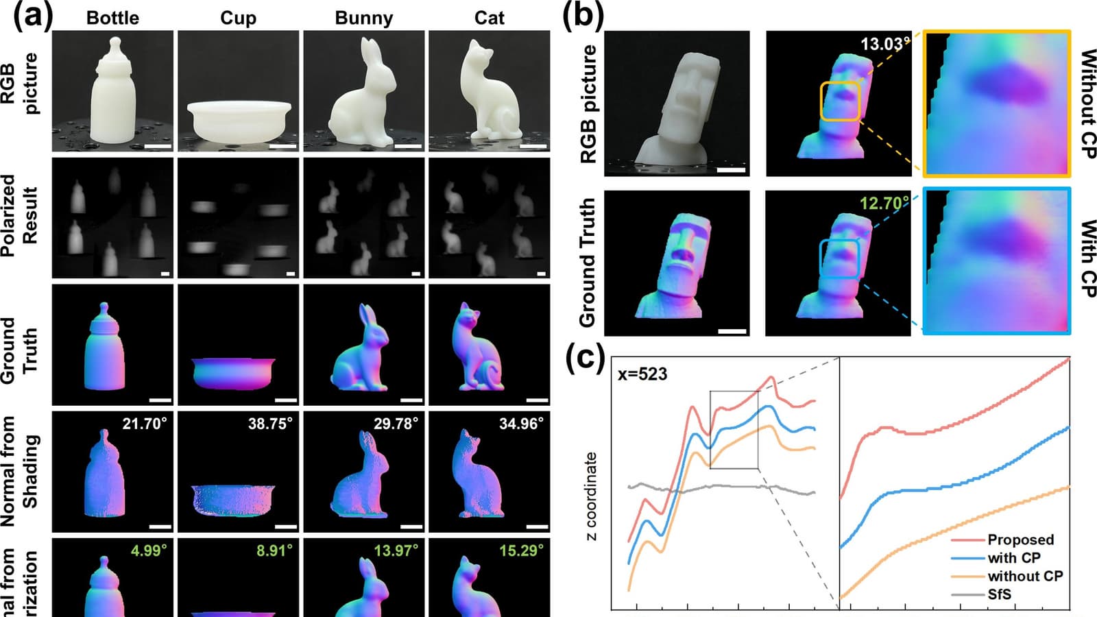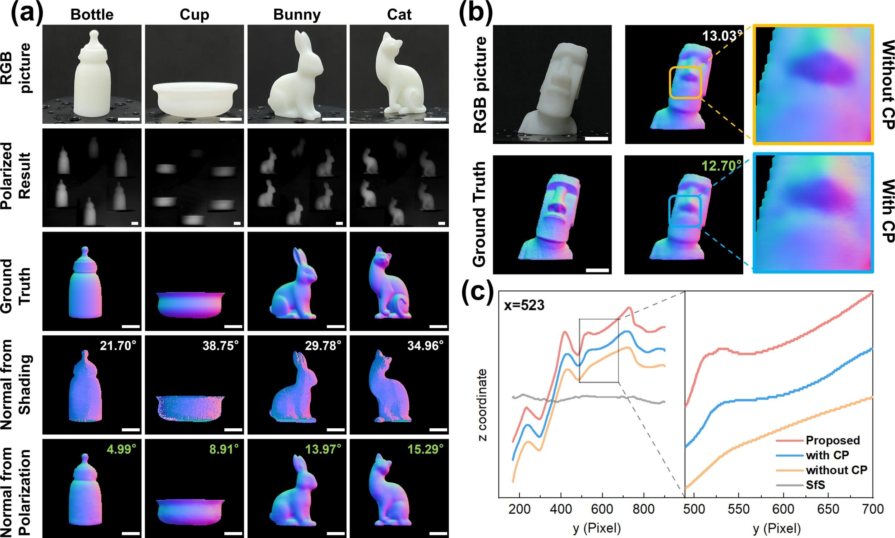 Ключевое отличие от традиционных методов — обработка данных нейросетью. Алгоритм анализирует параметры отражённого света, включая угол поляризации и степень рассеивания, а затем устраняет погрешности, вызванные бликами или гладкими поверхностями. Например, на тестах с прозрачными материалами система восстановила текстуры, которые не фиксируют обычные камеры. Эксперименты также показали, что пропуск круговой поляризации (одного из шести типов) снижает точность на 40% — этот параметр очень важен для работы с матовыми объектами или плавными изгибами.