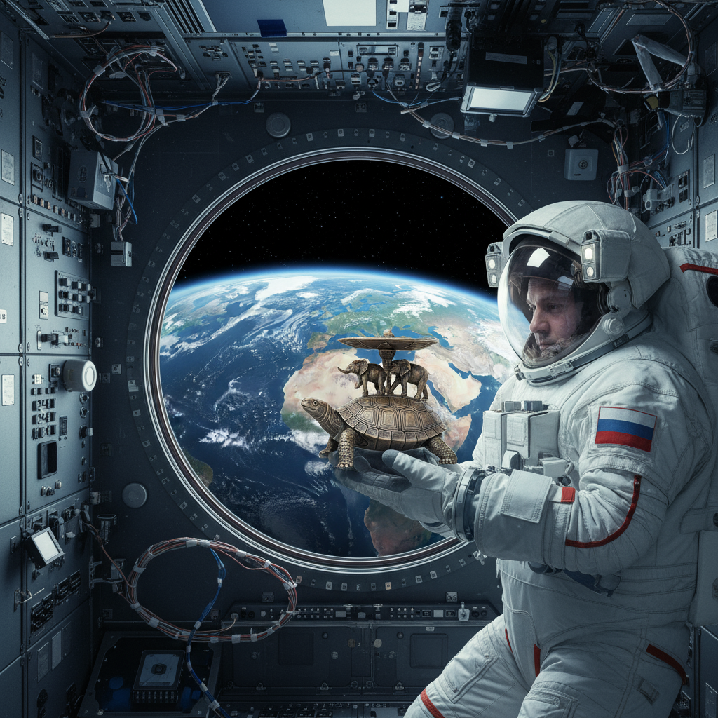 Спецкор ТАСС на МКС, космонавт Роскосмоса Иван Вагнер опубликовал фото с борта МКС, на котором изображена статуэтка с черепахой и слонам на фоне нашей планеты. Космонавт добавил, что до сих пор встречаются люди, отрицающие шарообразность планеты.
