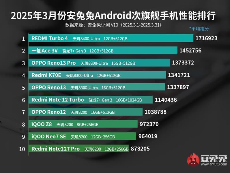 Разработчики AnTuTu опубликовали свежий рейтинг субфлагманских смартфонов — за март текущего года. Лидером с подавляющим преимуществом стал Redmi Turbo 4: только он смог набрать более 1,7 млн баллов.