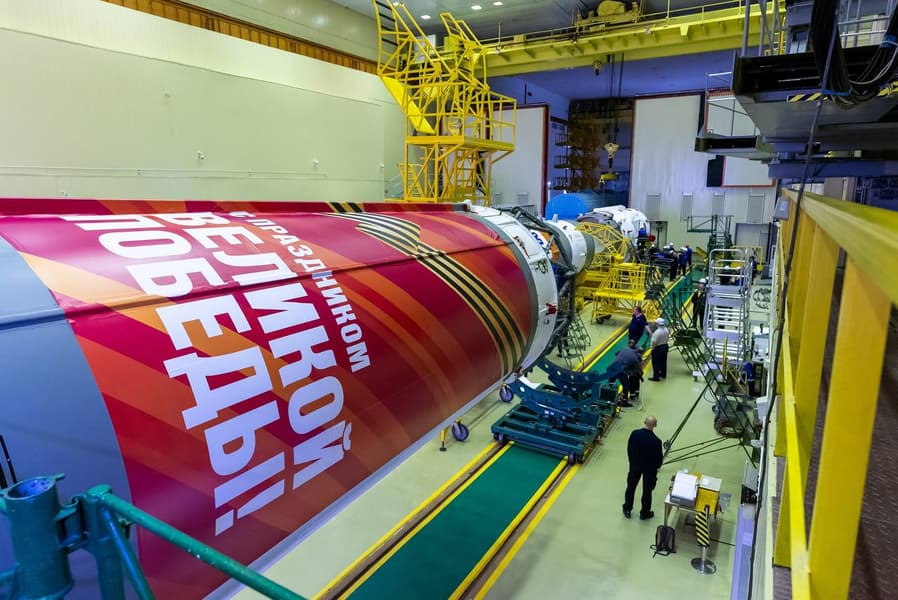На космодроме Байконур завершилась сборка ракеты-носителя «Союз-2.1а», которая получила название «Ракета Победы», в честь 80-летия Великой Победы.