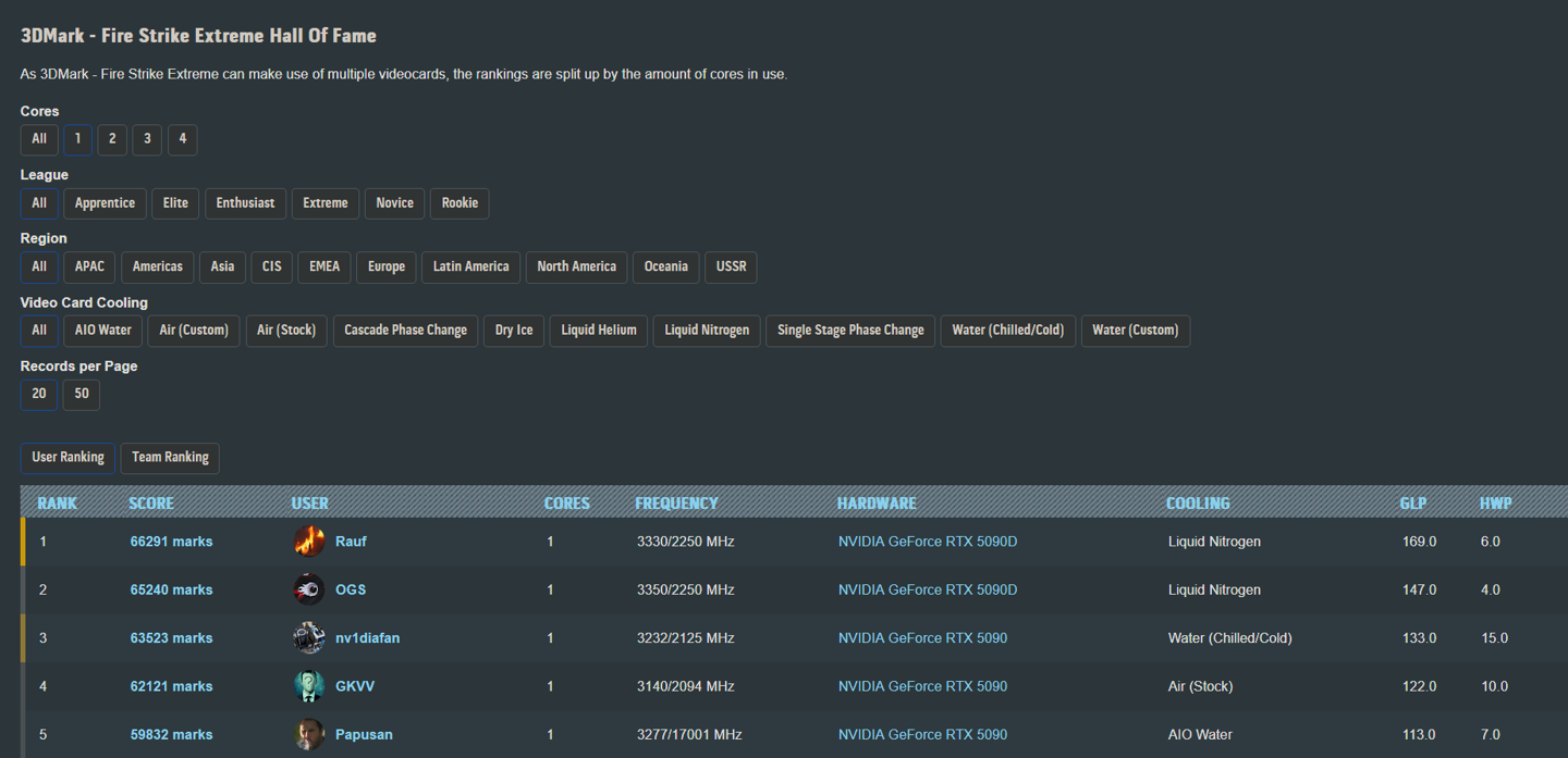 Как сообщает ITHome, первые места позволила занять GeForce RTX 5090D HOF OC Lab от Galax, и это далеко не обычная модель. Дело не только в использовании нестандартной системы охлаждения на базе жидкого азота: видеокарта-чемпион получила сразу два 16-контактных разъема и модифицированную BIOS, в которой планка потребления отодвинута за предел в 1 кВт (в тестовых системах использовались блоки питания мощностью 1,5 и 1,6 кВт).