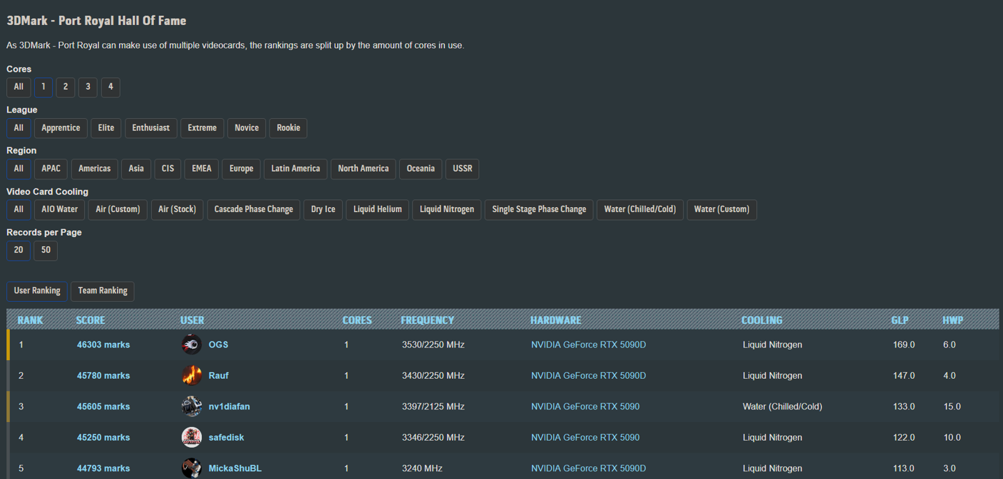 Nvidia создавала урезанную GeForce RTX 5090D специально для Китая, и этот ускоритель сейчас занимает первые места в рейтинге HWBot. В частности, GeForce RTX 5090D лидирует в бенчмарках 3DMark Port Royal, Vantage Extreme, Time Spy Extreme и Fire Strike Extreme.