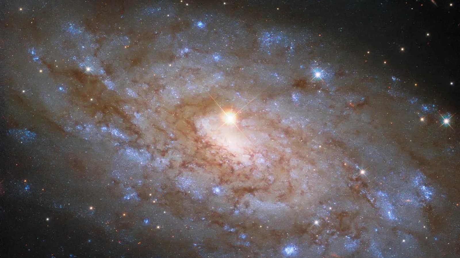 Центральный объект на снимке, который можно принять за сверхмассивную чёрную дыру, оказался звездой из нашего галактического соседства. Она расположена всего в 10 тысячах световых лет от Земли, а её свет, проходя через оптику «Хаббла», создал крестообразные дифракционные пики.