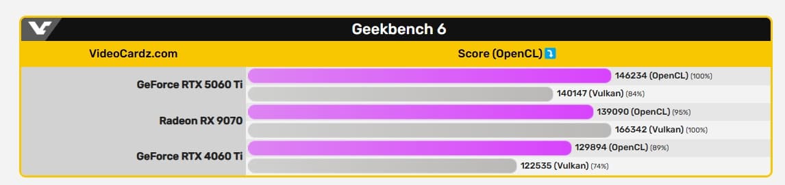 Пока что это тесты не в играх, а в Geekbench. Но мы видим, что новая карта быстрее предшественницы на 13-14%. При этом мы знаем, что RTX 4070 быстрее RTX 4060 Ti примерно на 30%. Это означает, что RTX 4070 будет опережать RTX 5060 Ti примерно на 15%. Это уже не такая большая разница, но всё же она имеется. К тому же не стоит забывать о разнице в объёме памяти. Да, будет и 16-гигабайтная версия RTX 5060 Ti, но она будет дороже, и не факт, что это будет выгодное предложение на фоне младшей версии или RTX 5070.