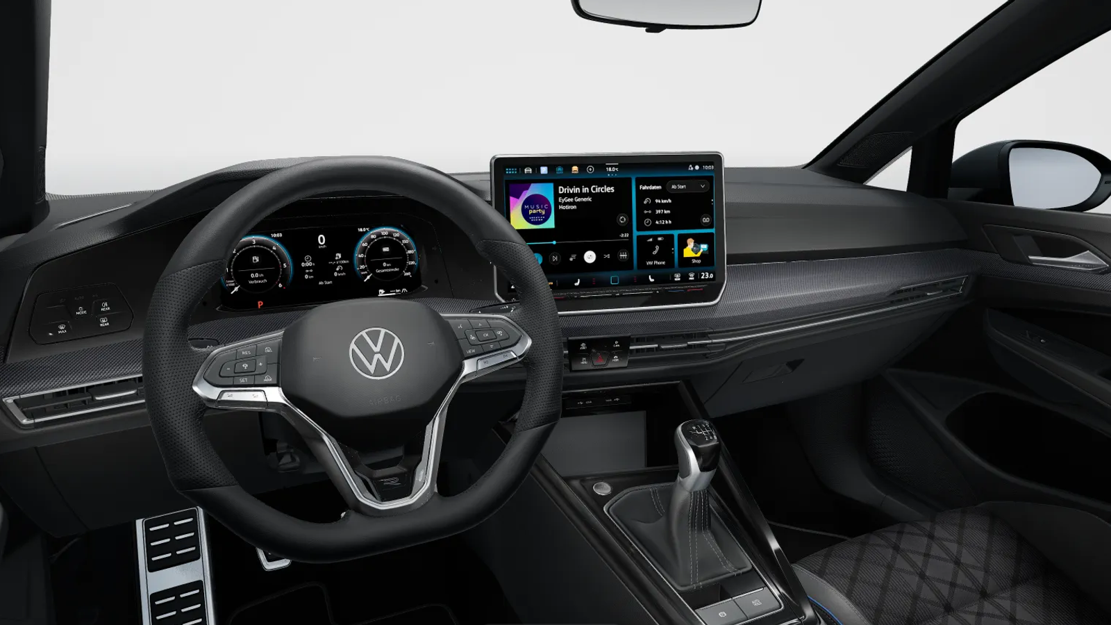 Volkswagen Golf 2025 R-Line оснащён электрическим усилителем руля и многозонным климат-контролем с управлением на руле. Салон отличается тёмной тканевой обивкой, кожаным рулём, обогревом передних и задних сидений, зеркал, заднего стекла и руля. Есть электростеклоподъёмники на всех дверях, электропривод передних сидений и зеркал с памятью настроек. Предусмотрены парктроники спереди и сзади, камера заднего вида, датчики дождя и света, круиз-контроль, контроль слепых зон.