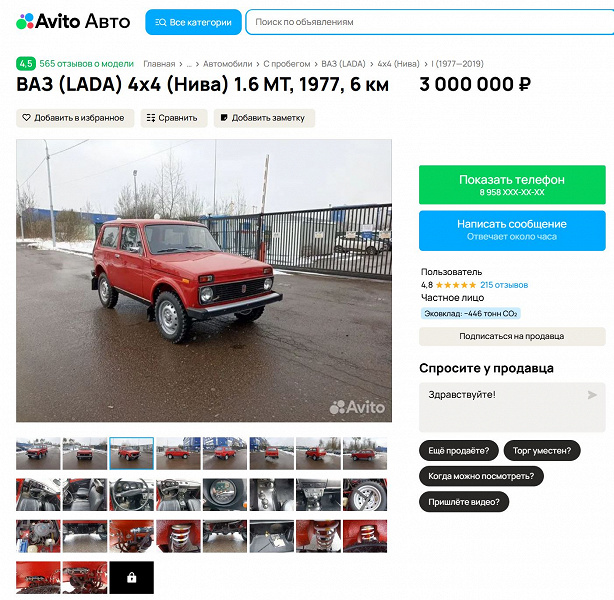 Особенность данной конкретной машины состоит в том, что пробег составляет всего 6 км. Просят за советский внедорожник в идеальном состоянии немало — 3 млн рублей (почти в два раза больше цены совершенно новой Lada Niva Sport).