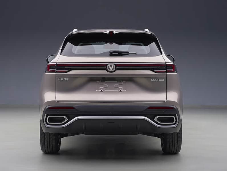 Обновлённый Changan CS55 Plus сохранил безрамочную решётку радиатора, но фары приобрели новый дизайн с бумерангообразными светодиодными дневными ходовыми огнями. В задней части — «сквозные» фонари и раздвоенный выхлоп.